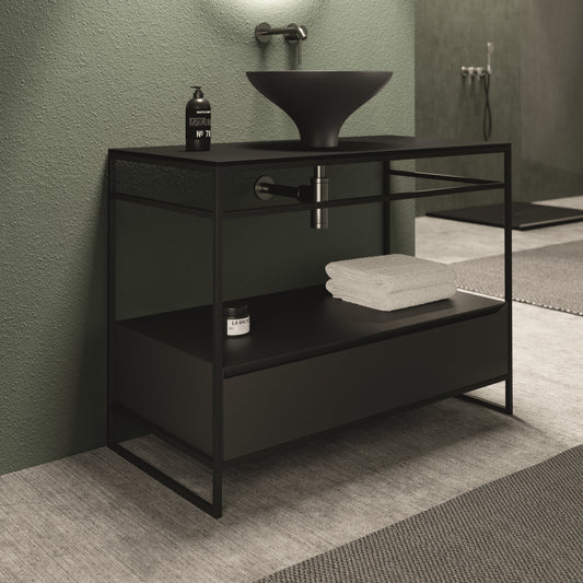 Uni: Designed with precision and durability in mind, UNI features a powder-coated stainless-steel frame paired with a wooden drawer that boasts a refined 45° cut and a soft-closing mechanism. The integrated top is crafted from ceramic, available in a wide range of colors and finishes to suit any style. This versatile piece seamlessly complements all our countertop washbasins, offering unparalleled design flexibility.
